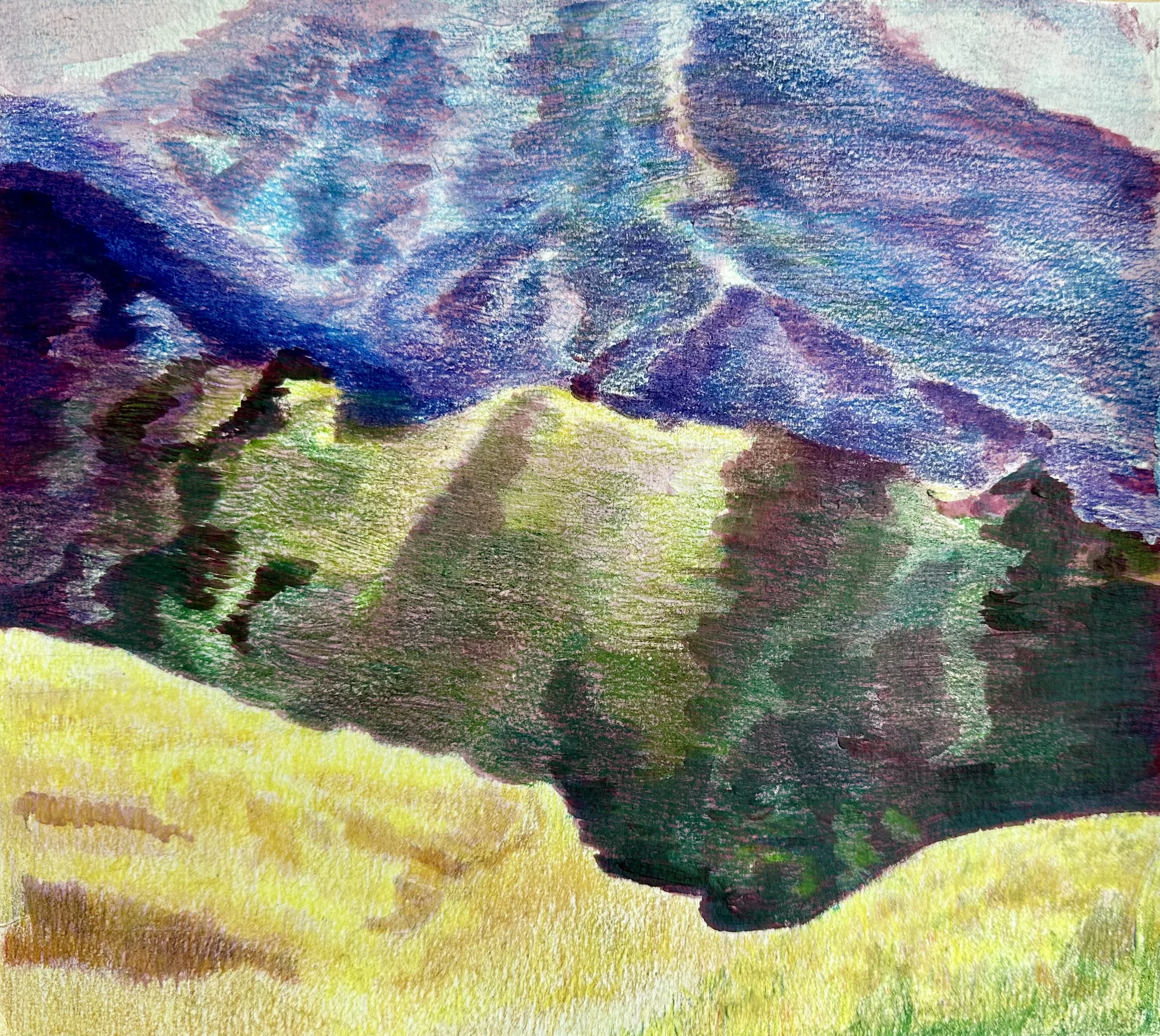 Atmospheric Perspective and Underpainting Project - 2024, 9x12 inches, acrylic and colored pencil on paper